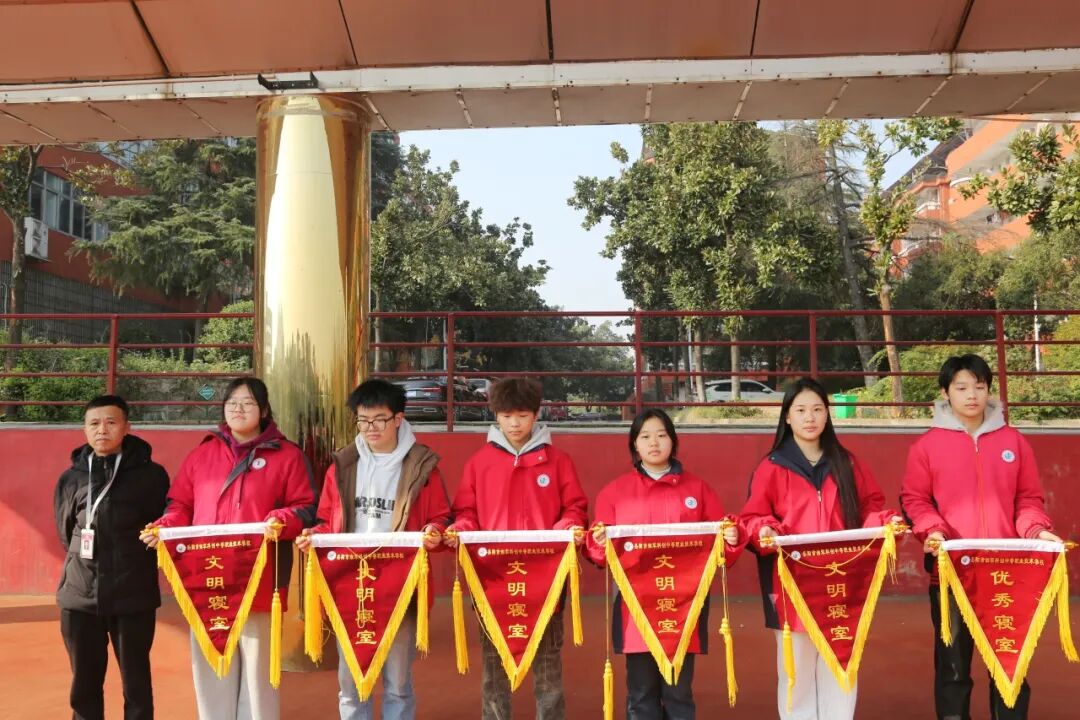 升旗仪式尾声,学校举行优秀班级与文明寝室颁奖仪式。校领导为 3 个 “优秀班级”、6 个文明寝室颁发流动红旗,鲜红旗帜既是表彰,更是传递校园正能量的风景线。