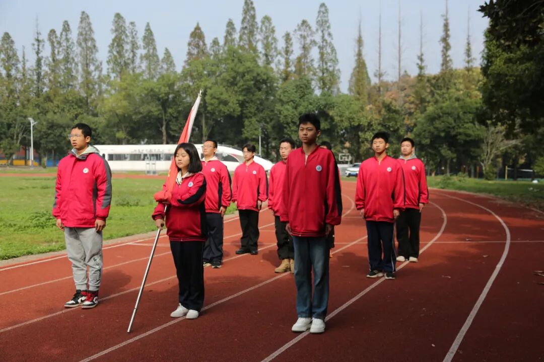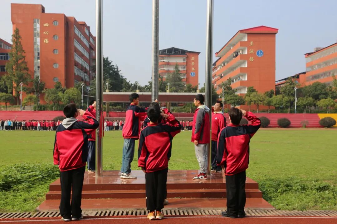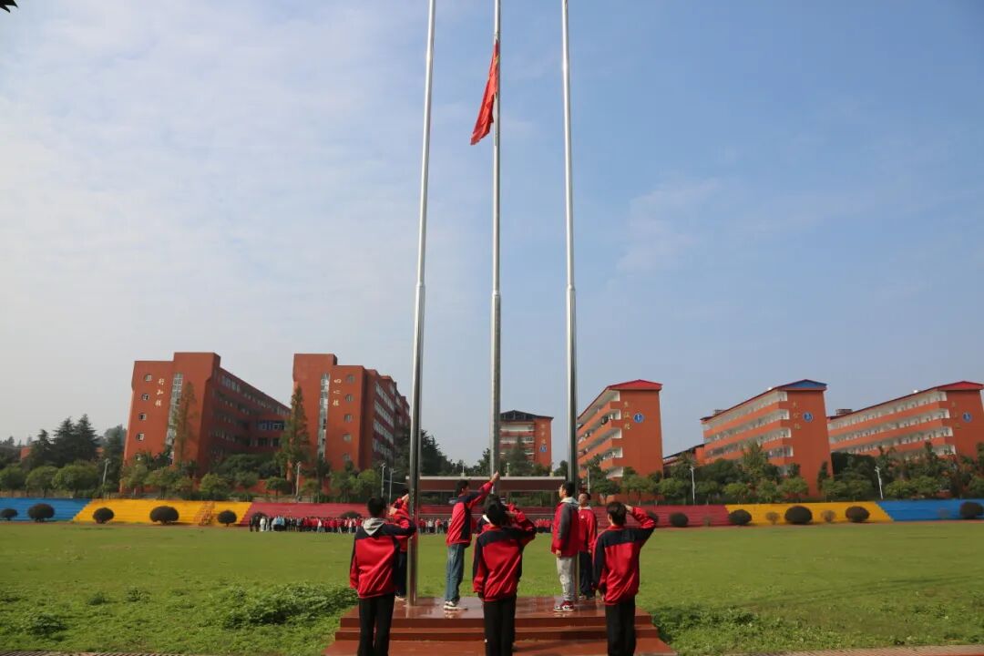 清晨的升旗,全体师生身着统一的红色校服,在操场列队完毕。国旗护卫队的 9 名队员他们身姿挺拔,迈着整齐的步伐走向旗杆。